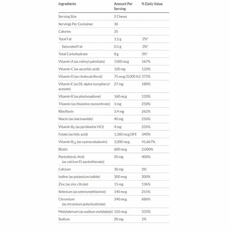 Bariatric Advantage Multi Chewy Bites is a delicious high potency multi specifically designed to help meet the nutritional demands of bariatric patients, delivering at least 200% DV of 16 key nutrients including vitamins B1 B12, and D3—all in a delicious soft chew.