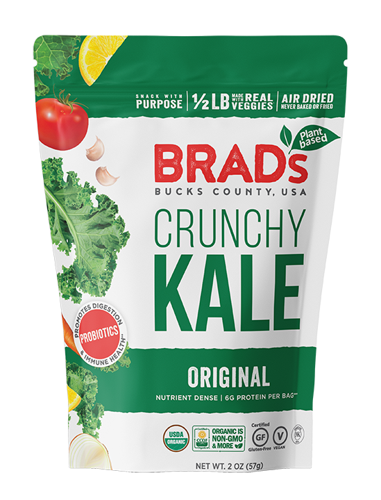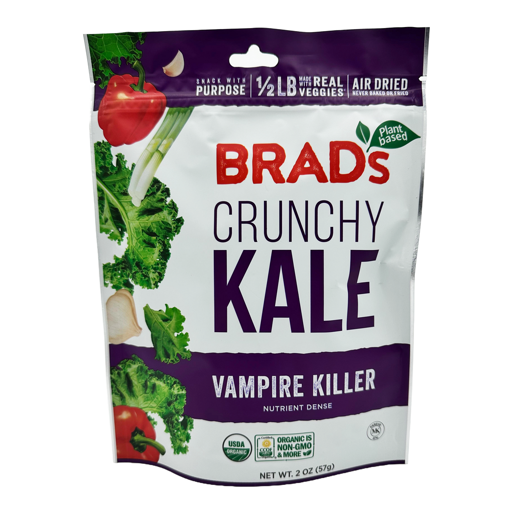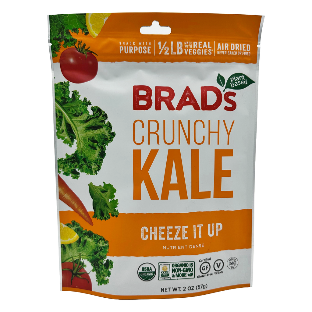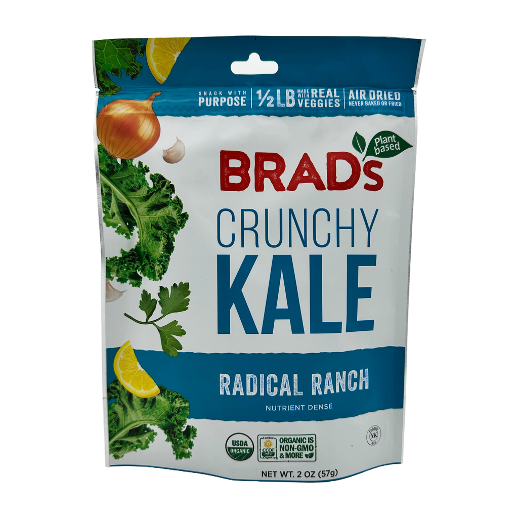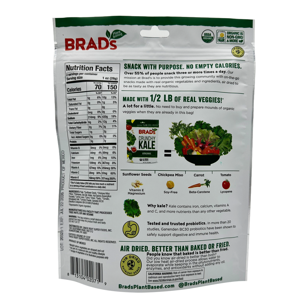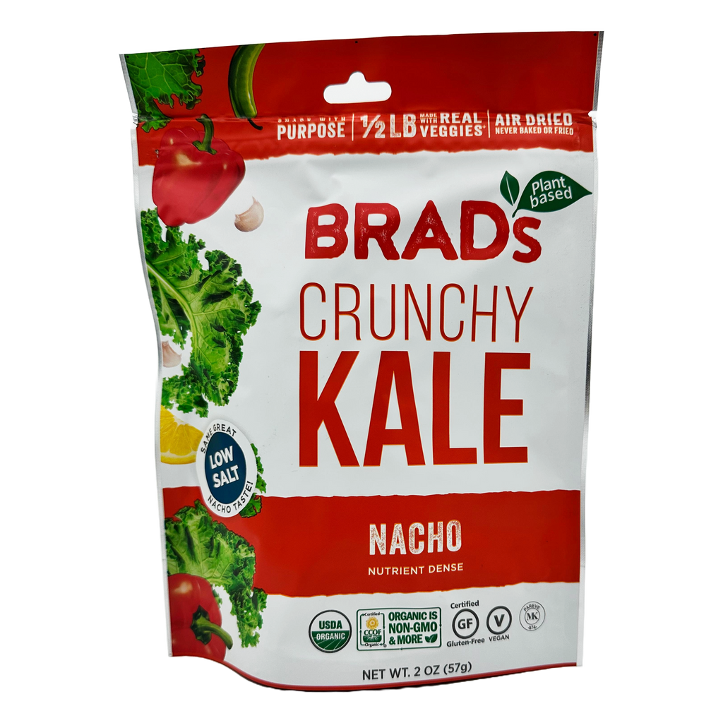 Brad's Raw Foods Crunchy Kale starts out with the most nutritionally dense leafy green vegetable available... fresh, leafy kale. They batter it up with flavorful, natural ingredients including raw cashews, sunflower seeds and spices to give the kale that extra punch of flavor. These Kale chips are then dehydrated below 115 degrees (retaining active enzymes) to transform it into a light, crunchy and delectable snack food.