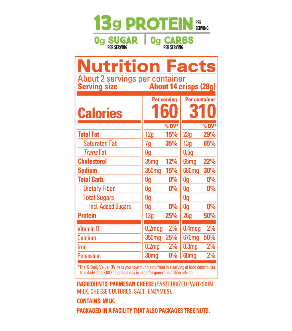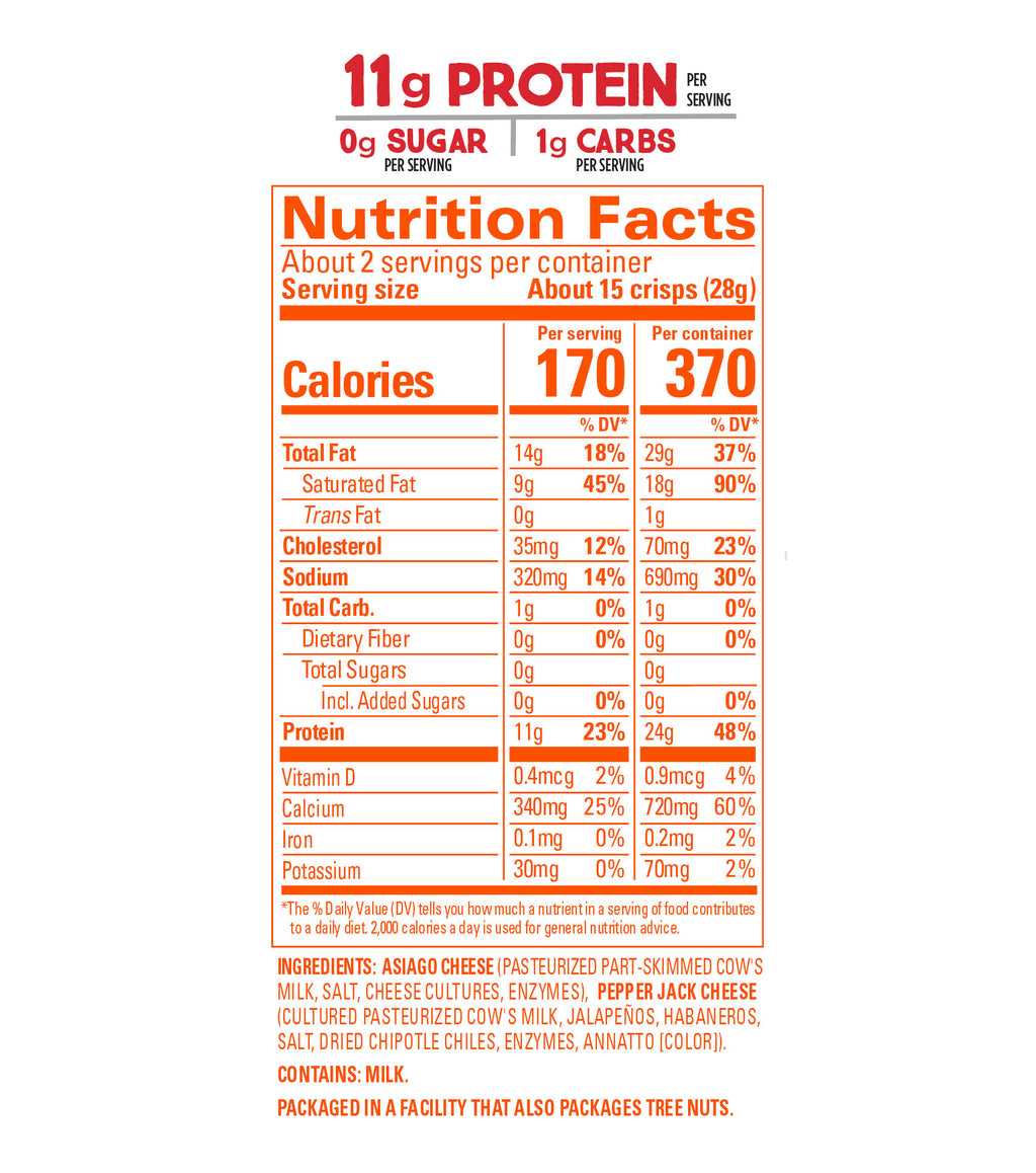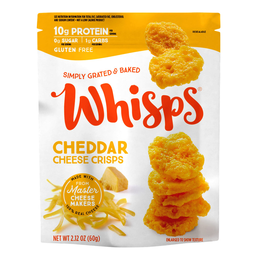 Whisps Cheese Crisps are made from award-winning cheese and baked into a flavorful, airy, crispy - Whispy - bite. An excellent source of protein and calcium, Whisps Cheese Crisps give you a feel-good, real food snacking experience without the guilt. Whisps are great as a low carb cheese snack or toss them on a salad or appetizer plate for flavor and crunch.