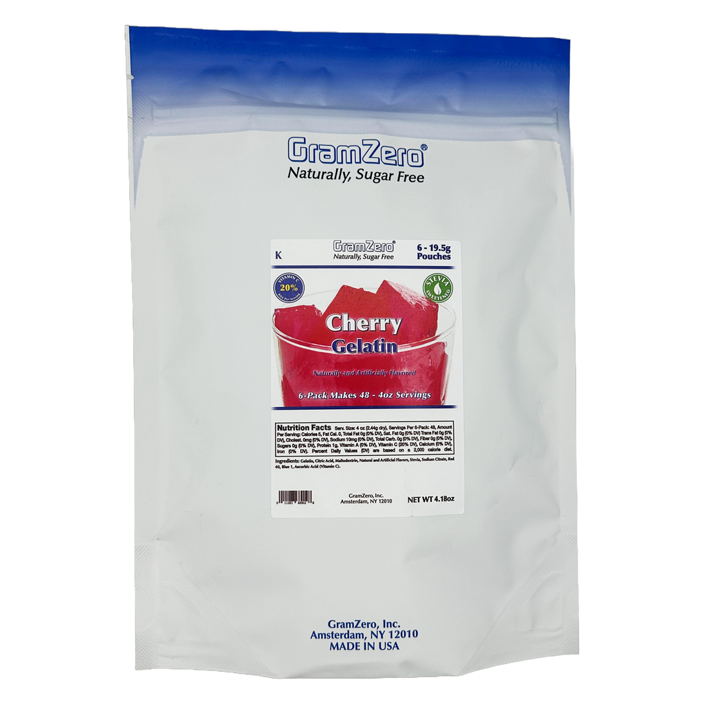 GramZero Sugar Free Gelatin Mixes are low carb gelatin mixes that are sweetened with Stevia and fortified with 20% RDA Vitamin C. GramZero Sugar Free Gelatin Mixes taste like sugar sweetened gelatins with no aftertaste, yet register zero grams of sugar, zero calories and zero sugar alcohols.
