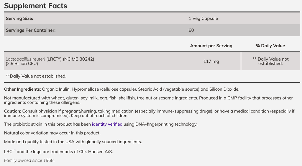 NOW® Heart Health Probiotic features Lactobacillus reuteri LRC™, the first clinically validated heart health probiotic.* LRC™ has been shown to support cholesterol levels already within the healthy range by helping to maintain healthy cholesterol production in the liver and by supporting the body’s normal cholesterol elimination pathways.* LRC™ can also promote a balanced immune system response and normal CRP (C-reactive protein) levels, which can further support cardiovascular health.* This strain has also been shown to improve vitamin D levels.*