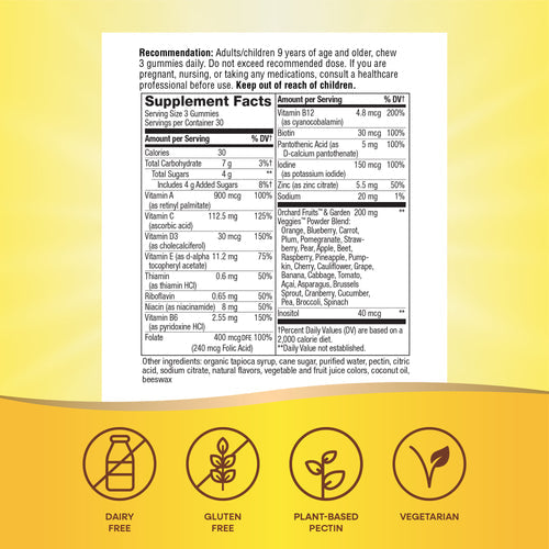 Nature's Way Alive! Adult Premium Gummy Multivitamin are formulated for specifically for all adults. With 14 vitamins and minerals, including the full B-vitamin complex to convert food into fuel, these adult gummy mult-vitamins contain no artificial flavors or preservatives. Nature's Way Alive! Adult Premium Gummy Multivitamin contains their unique food-based Orchard Fruits and Garden Veggies powder blend.