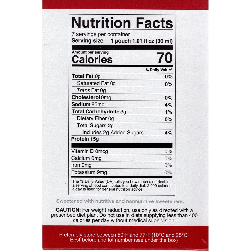The Proti Diet Tropical Fruits liquid concentrate has only 60 calories, zero fat and 15 grams of protein per serving. This delightful Tropical Fruits flavored protein diet drink comes in easy-to-open liquid packets that you simply pour into a glass or bottle of cold water give it a shake and enjoy!