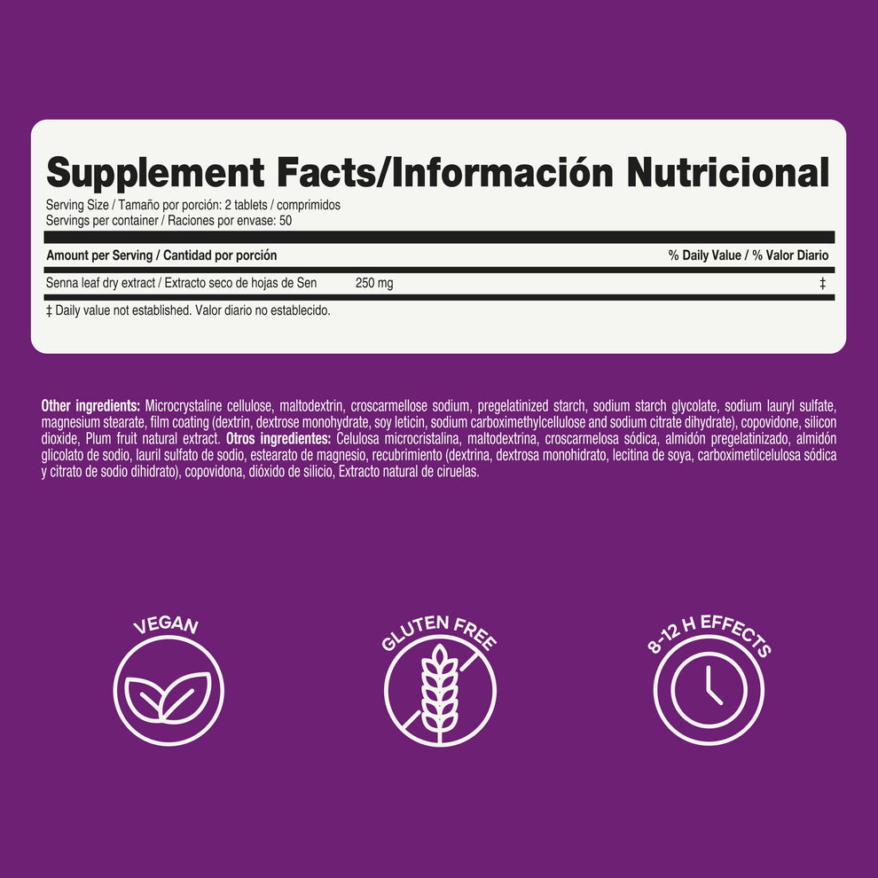 Active Ingredients: Prunes extract, Cassia angustifolia vahl, Cassia senna L. Inactive Ingredients: Sodium Starch Glycolate, Polyvinylpyrrolidone, Copolyvidone, Opadry NS Clear (Coating), Colloidal Silicon Dioxide, Sodium Lauryl Sulphate.