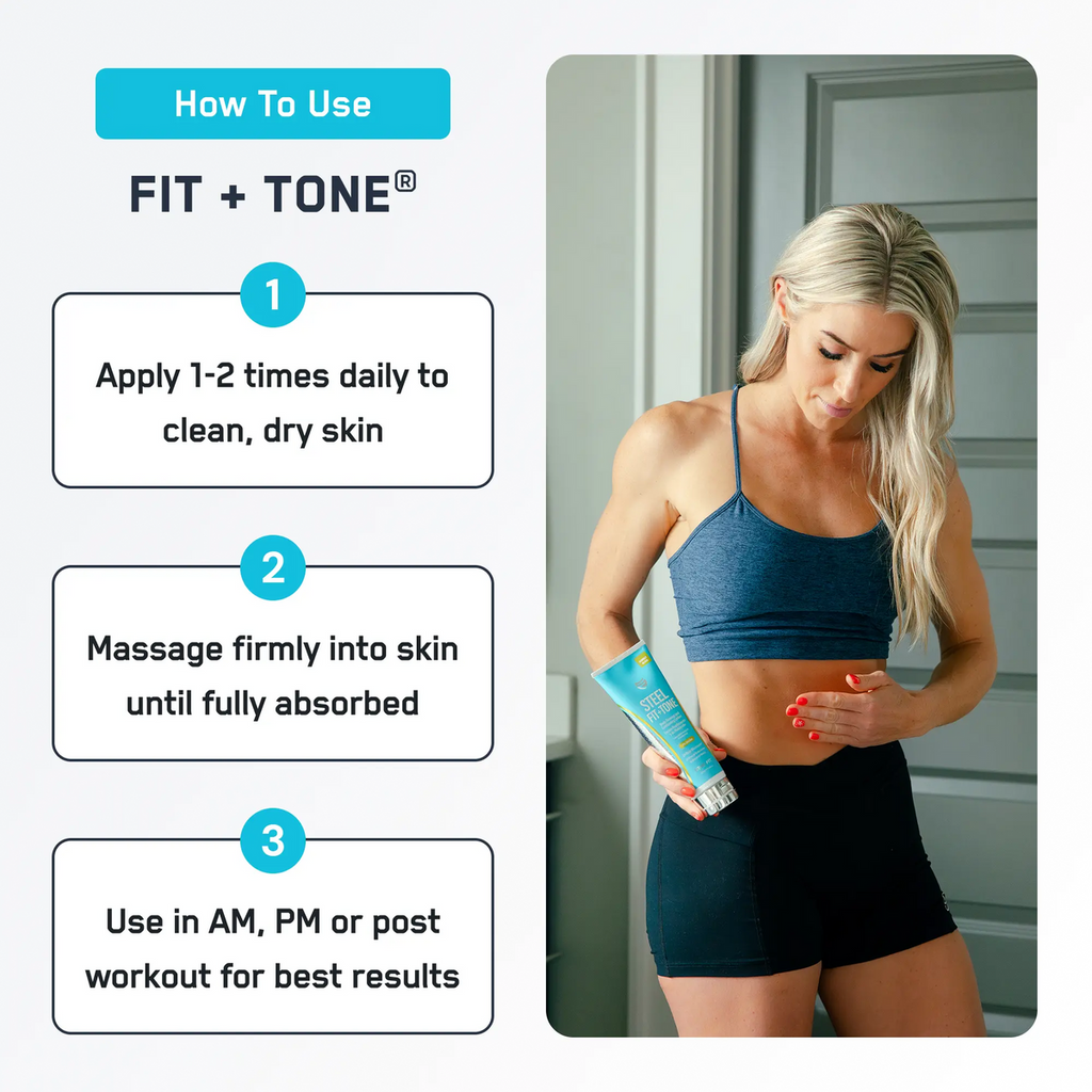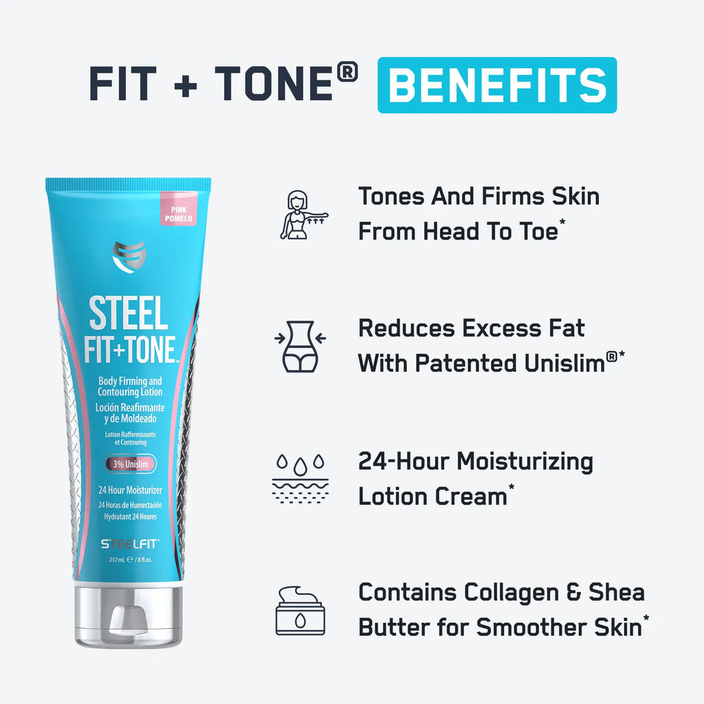 Apply Steel Fit + Tone body toning lotion on the skin for firmer, more toned, nourished skin. Firmly massage into skin until fully absorbed. For optimal results, apply twice daily in the AM and PM.
